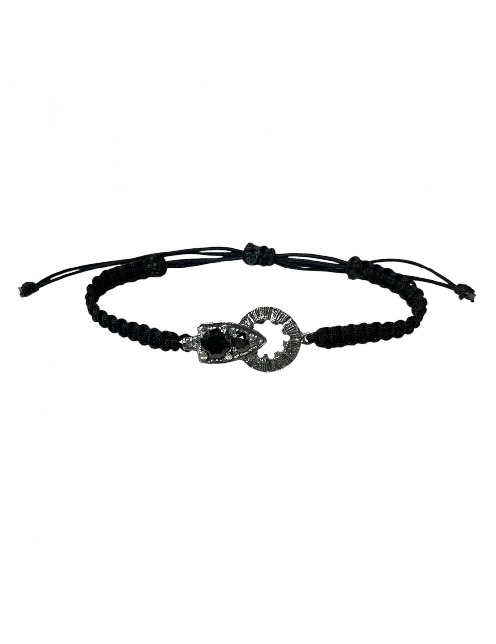Pulsera Virgen del Pilar de 3 cm  con macramé de la colección Vintage. Realizada en Plata de Ley con tratamiento de oxidación, con el manto engastado en circonitas negras con pequeñas garritas.